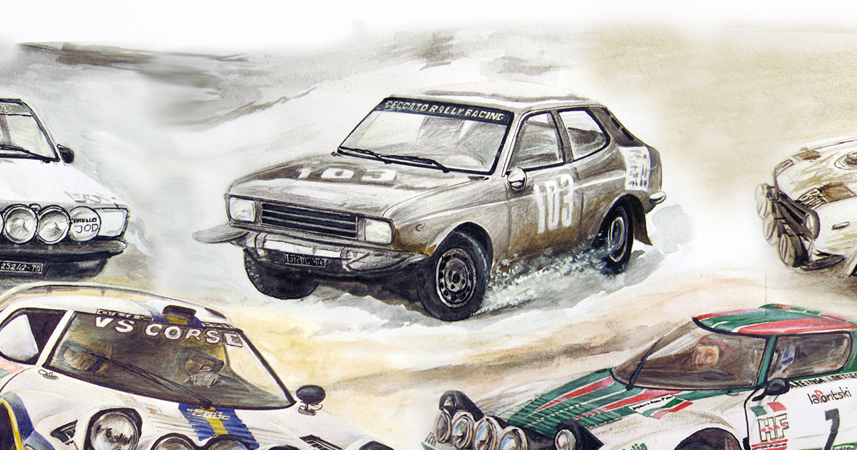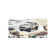 Anno: 2015 - Evento: Ciao Attilio, 1985/2015 Parte di una illustrazione raffigurante tutte le vetture utilizzate in carriera da Attilio Bettega, realizzato in occasione del trentennale della sua scomparsa al Tour de Corse-Rallye de France 1985 | ||