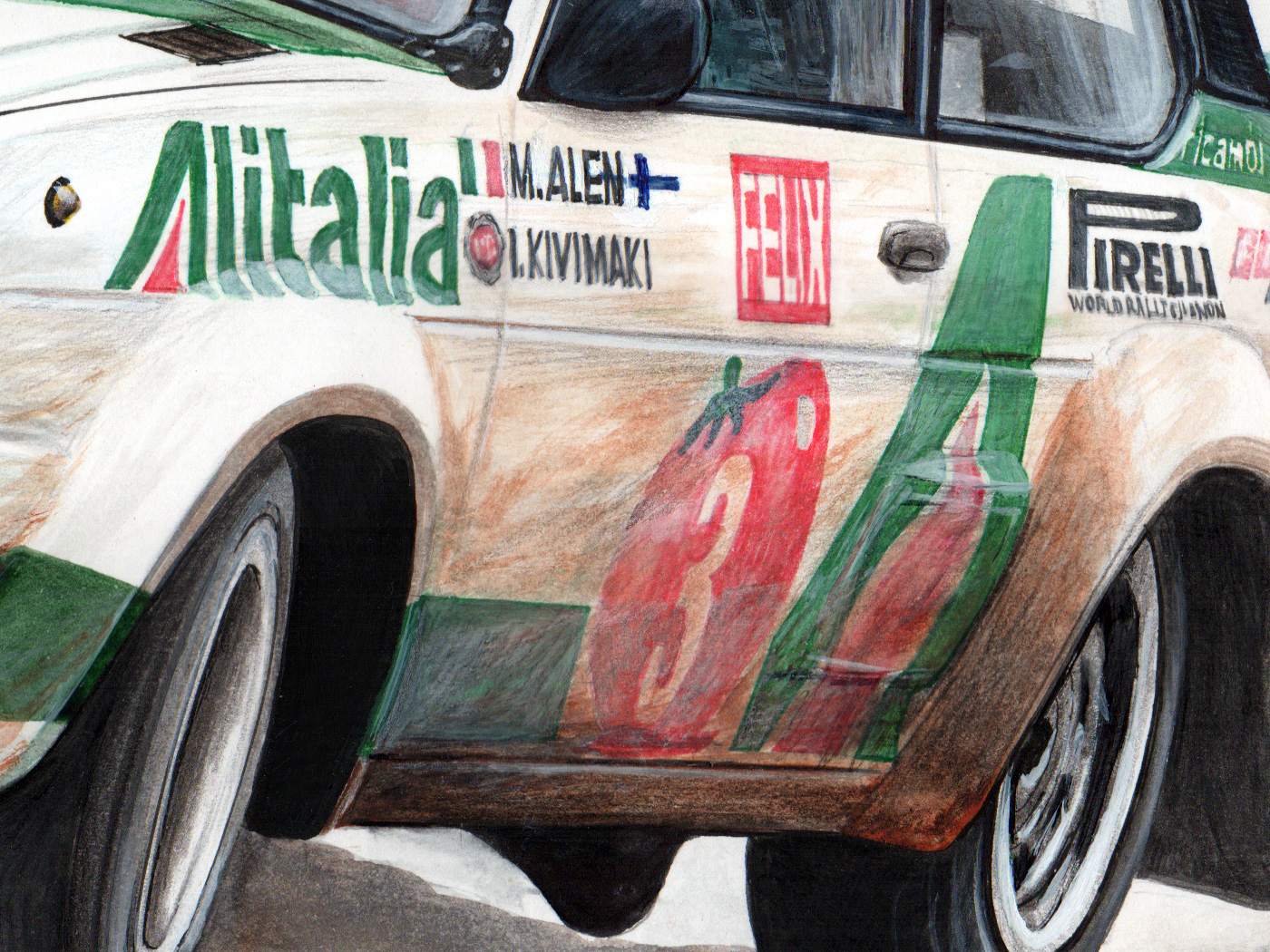Dipinto celebrativo vittoria Alén/Kivimäki al Jyväskylän Suurajot Rally of the 1000 Lakes 1978 Supporto: Cartoncino 48 cm x 33 cm - Tecnica: Pennelli, chine, matite e acrilico | ||